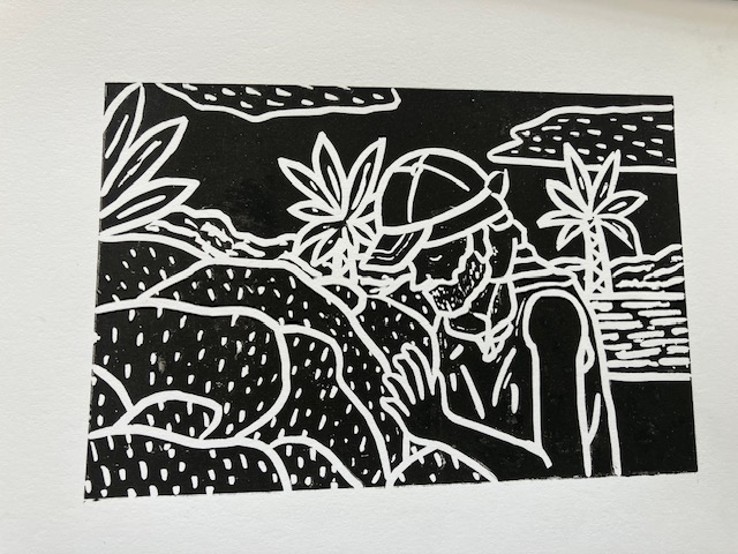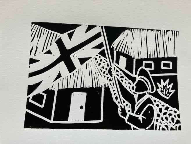 These are Assisi’s linocuts for the video, Requiem for the Sixth Extinction, which gives a brief history of Kiribati and its present crisis